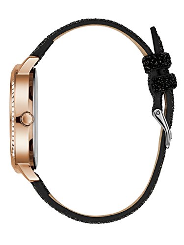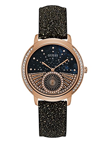 Celestial-inspired watch illuminates your look with a rose gold-tone casing and black textured glittering strap.
