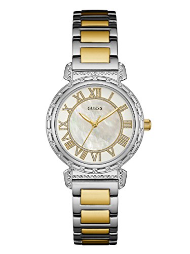 Two-tone analog watch with crystal-embellished bezel, mother-of-pearl dial and polished bracelet.