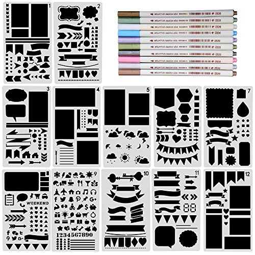 BULLET JOURNAL STENCIL SET: 12 different bullet journal stencils and 10 metallic marker pens are designed for you to create your perfect daily, weekly & monthly spreads.