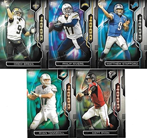 2015 Topps Football Complete 4000 Yard Club 11 card insert set including Tom Brady, Peyton Manning, Drew Brees, Matthew Stafford, Matt Ryan, Philip Rivers, Ben Roethlisberger, Aaron Rodgers, Andrew Luck, Eli Manning and Ryan Tannehill.
