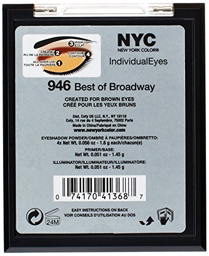 Discover NYC New York Color individual eyes custom compact, the all-in-one compact with everything you need for a complete eye look, primer, illuminator, applicator and complementing shadows With four colors, specially coordinated to intensify and enhance your eye color, you can create a look as individual as you are Make your eyes pop Brand : N.Y.C. Item model num : 27322105946 MPN(PartNumber) : 27322105946 EAN : 0074170413687