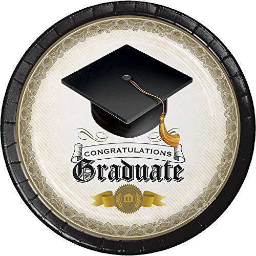 -. Feature : Graduation Party Supply Pack for 8 Guests / 8 ct. 8 3/4" Plates; 8 ct. 7" Dessert Plates / 16 ct. Luncheon Napkins, 24 ct. Black Velvet Assorted Cutlery: (8 each of forks, knives and spoons) / Traditional Design Perfect for Grad School, College, or High School Graduation Celebrations / Celebrate graduation with our Classic Cap & Gown collection, a traditional design pattern in ivory, black and gold, with classic mortarboards and diplomas.