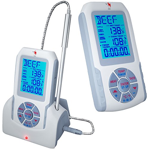 THE SECRET TO NEVER OVER-COOKING YOUR MEAT... OR WORSE, UNDER-COOKING IT! We've all done it! There is nothing more frustrating and embarrassing that can happen at your cookout. (In most cases!) What is even more frustrating is overcooking an item that has taken hours and hours to cook in a smoker or oven... And, do not get me started with undercooking, that can be a very gross discovery! Those Less Than Stellar BBQ Days Are Gone! KONA(tm) Wireless BBQ Thermometer allows you to remotely monitor your rack of lamb or prime rib easily and wireless-ly. The settings are extremely easy to set manually or by selecting the preset ideal done-ness levels. Then you can wander off with the remote sensor attached to your belt clip. Features Benefits -Stainless Steel Probe Connecting Wire -LED Screen With Easy To Read Blue Backlight Funtionality -Meat Type Done-ness Level Selection -Current Temperature, Target Temperature and Timer Display (F/C) -Count Up and Count Down Option -Alerts When Target Temperature Is Reached -Ideal Range Up To 70ft -5 Year "No Hassle" Warranty Enjoy Clean Healthy Eating Occasionally you may catch yourself looking down at the LED screen to see the current temperature. But after a few uses you will quickly learn to trust the alarm notifying you that your favorite morsel is cooked just the way you like it. Preset Settings For Fish, Beef, Lamb, Veal, Hamburger, Pork, Turkey and Chicken Requires 4 AAA Batteries (Included) Money Back Guarantee If you're not happy with our tough BBQ thermometer, we will fix the situation, hassle free. CLICK "ADD TO CART" NOW - We Won't Be Offering This Amazing Deal For Long! 0 |