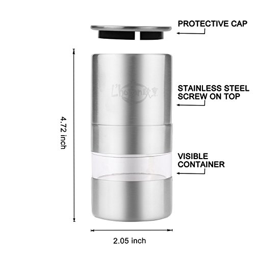 ♥ STURDY STAINLESS STEEL FRAME—both ends of the grinder are made of brushed stainless steel. It won't break even if it falls to the ground. The transparent part is acrylic which can withstand the pressure of the rotation
