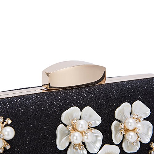 -. Feature : MATERIAL: Made from satin,polyester lining,with clasp closure,light weight and portable. / SIZE: Approximate measurements- 7.87"(L)*1.77"(W)*4.72"(H). / FEATURES: Fashionable flower beaded and rhinestone is designed for elegant ladies, CAN be used as a shoulder bag or crossbody bag,O-shaped chain can be hidden inside to make it into a clutch. (O-shaped chain wouldn't caught or pulled hair or dress) / CAPACITY: Inside can easily fit a cell phone(iphone 7s plus), wallet,car keys,compact mirror, lipstick, and some makeup. / OCCASION: Elegant flower pearl design clutch bags perfect for Wedding Parties or a Night Out and Formal Cocktail!!!
