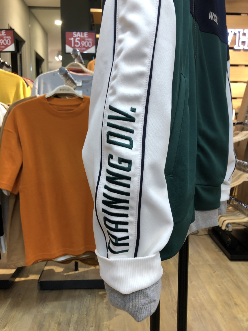 양쪽 팔 부분에는 영어 문구가 자수로 들어가