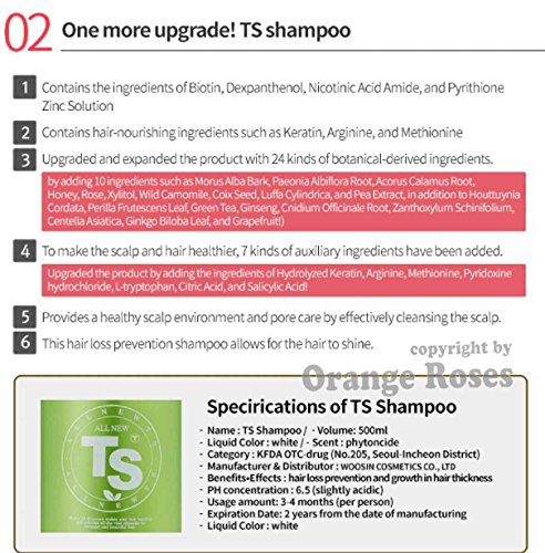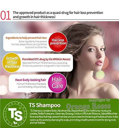 - Premium TS shampoo is an OTC product with the effect of preventing hair loss and thickening hair. It enables healthy hair with the ingredients of Biotin, Dexpanthenol, Nicotinic Acid Amide and Pyrithione Zinc Solution. It contains 24 kinds of botanical-derived extracts such as Houttuynia Cordata, Perilla Frutescens Leaf, Green Tea, Ginseng and Cnidium Officinale Root, as well as 7 kinds of ingredients that provide a healthy scalp environment such as Keratin, Arginine and Methionine.
