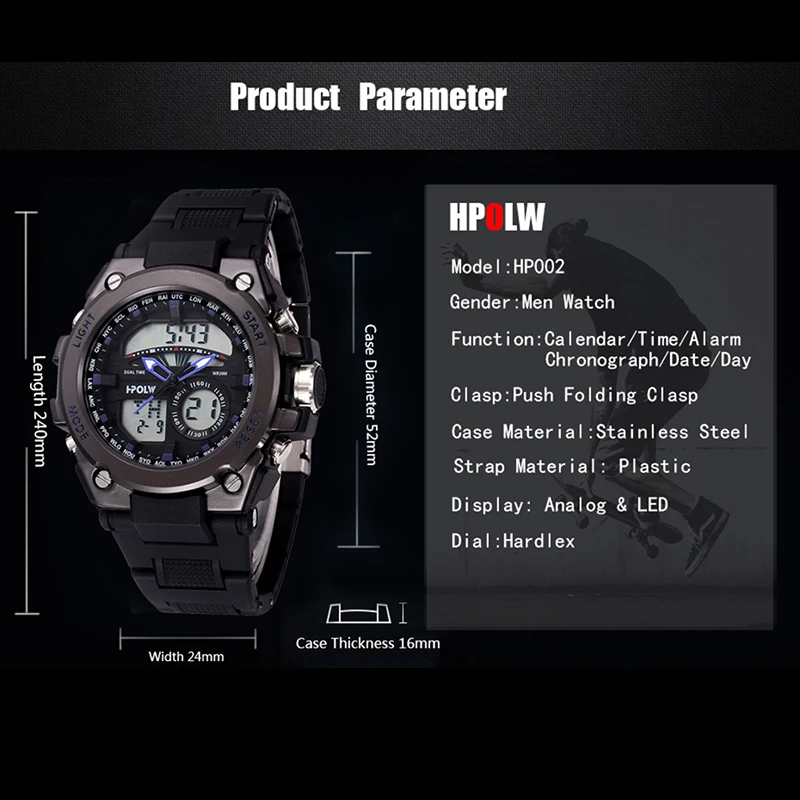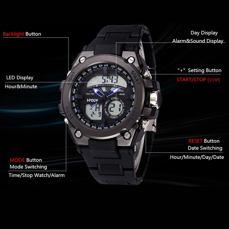 Feature:Water Resistant,LED display,Multiple Time Zone,Auto Date,Complete Calendar,Shock Resistant,Anti-magnetic,Alarm,Chronograph