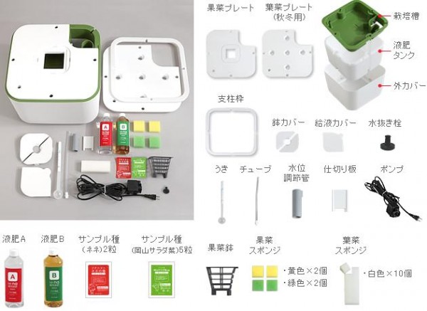| セット内容 | 本体(栽培槽・液肥タンク・外カバー)、果菜プレート、葉菜プレート、支柱枠、鉢カバー、給液カバー、水抜き栓、うき、チューブ、水位調節管、仕切り板、ポンプ、葉菜スポンジ(黄×2・緑×2)、果菜スポンジ(白×10)、果菜鉢、サンプル種(ネネ(ミニトマト)×2粒・岡山サラダ菜×5粒)、アクア栽培用液肥(A・B)、取扱説明書、保証書(保証期間:1年) |