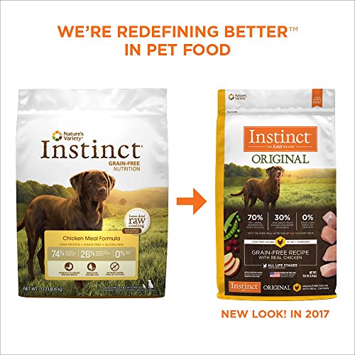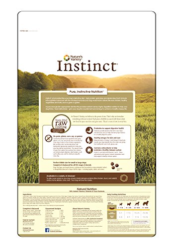 Nature's Variety Instinct is formulated like your dog's ancestral diet - high protein, grain-free, and gluten-free. Each formula is thoughtfully balanced with the wholesome foods your dog would eat in nature, like real meat or poultry, healthy vegetables and fruits, and no grain or gluten. A pure, biologically appropriate diet like this provides nutrient-rich, highly digestible nutrition to help pets thrive. Feed ancestrally – give pets the nourishment and energy to achieve a healthy, happy life. Complete and balanced for all life stages (including puppy, adult and senior) and all breeds (perfect kibble size for small to large dogs). Made in USA facilities.Feature
