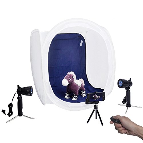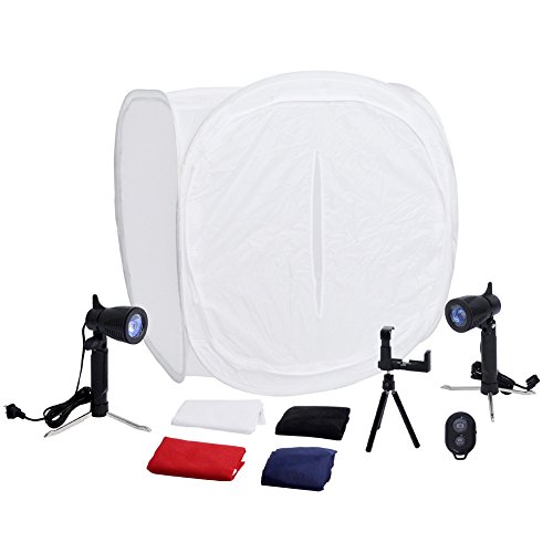 - Feature : (1) 24"/60cm Photo Studio Light Tent Diffusion Soft Box Shooting Cube (includes 4 colors background) / (2) 5000K 50W Photo Box Table Top Accent Lights with Stand / (1) Tripod with 360-degree Swivel Panhead and 1/4" Mounting Screw + Adjustable Phone Holder / (1) Wireless Bluetooth Remote Control Camera Shutter for iOS iPhone Android
