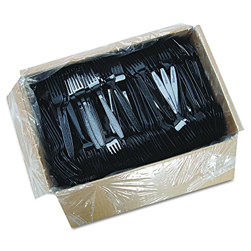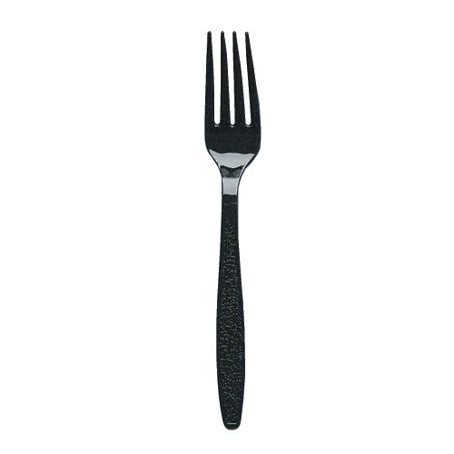 This SOLO GDR5FK-0004 Guildware Extra Heavy Full-Size black polystyrene fork is 7" long and is suitable for food service applications where dense foods such as steak or fish are served. The fork is made of polystyrene for greater strength and rigidity than polypropylene. It has a textured handle for visual appeal and can be used with hot or cold foods. This Guildware black polystyrene fork is suitable for use at catered events and in other food service applications where durable flatware is required.