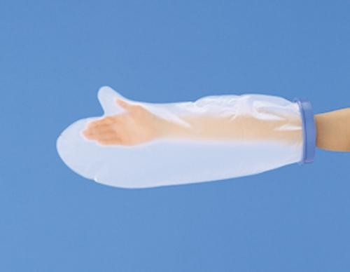 包帯やギブスに水の侵入を防ぐ防水カバー(腕用)です。片手で簡単に取り付け、取り外しができ、繰り返し使用できます。