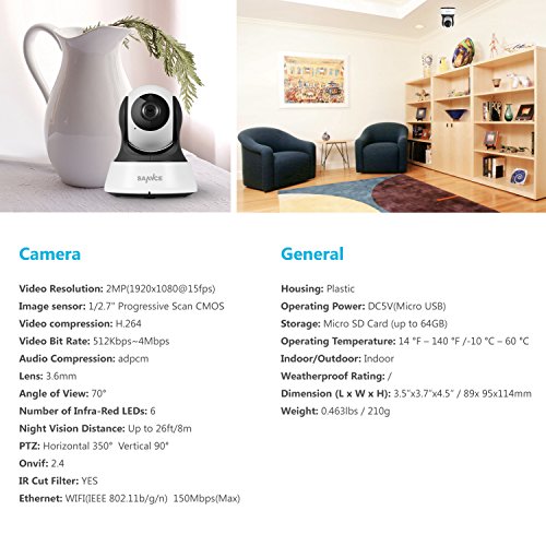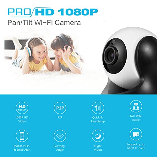 -. Feature : IP CAMERA REMOTE ACCESS: Not only can you watch live footage at home, you can also remotely spying your house via smartphone, tablet or computer with the free app / IP CAMERA MOTION DETETION ALARM: Motion detection works perfectly with alarm function. You'll receive instant alarming push notifications when suspicious movement is detected / IP CAMERA TWO-WAY AUDIO: Talk and listen to your kids remotely is never a problem with the high quality built-in microphone and speaker / IP CAMERA 1080P HD FOOTAGE: Enjoy the difference 1080P video brings, you'll never have to strle in identifying faces and license plate numbers, all will captured by the camera will be presented in great detail / IP CAMERA SMOOTH PAN & TILT: Stable and smooth 350°pan and 100°tilt enables you to get a sweeping view of your entire room and never miss anything vital. Moreover, you can control it via your mobile devices