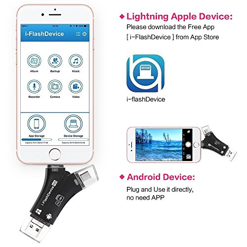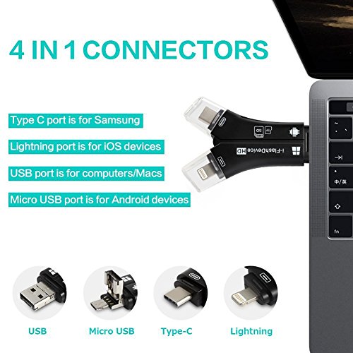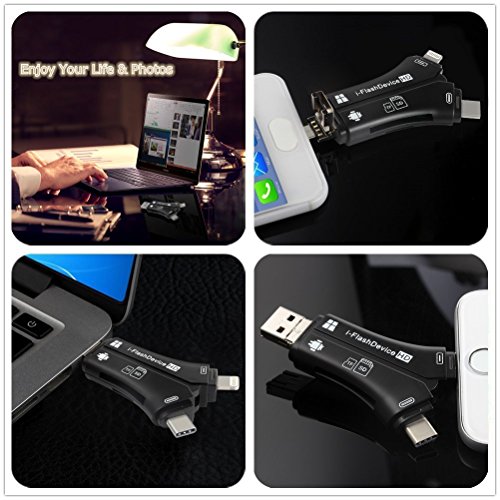 4 in 1 Connectors: This card reader has four different interfaces/ Lightning connector is for iphone ipad iOS devices/ Micro USB connector is for Samsung Android devices/ Type C connector is for Samsung LG/ USB connector is for computers/Macs.