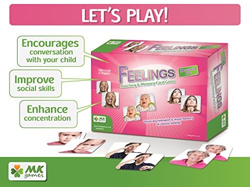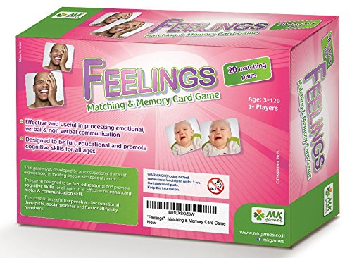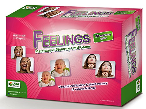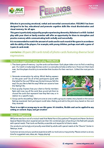 Feelings, Photo-based Matching and Memory Game The classic game of matching and memory was designed for professionals who work with special needs' clients of all ages. Generate conversation with 20 sets of photo tiles of different facial expressions. Recognize and explore various emotions as well as verbal & non-verbal communication. Children and the eldery with memory challenges alike will enjoy recognizing and identify emotions in others; an experiential opportunity to share and process. There is no right or wrong way to use this game. It's intuitive, flexible and can be applied to any setting or content. Enjoy and get creative! About MKgames: MKGames was born out of a mutual need that Meital Karni (Occupational Therapist) and Keren Strolovici (Special Needs Educator) experienced over their 30+ combined years of working in the field with people with special needs. They needed games and puzzles that were flexible, accessible and respectful of their clients age and dignity. And so MKGames was born!Feature