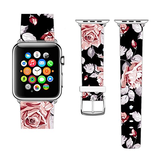 Apple Watch Band 38mm, Replacement Band Genuine Leather Iwatch Strap With Silver Metal Clasp For iWatch 38mm Black Background Red Big Flowers Theme