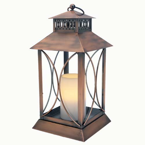-. Feature : Lantern holder crafted of metal with glass panes / 3x5-inch ivory flameless pillar candle included / Requires 2 C batteries (not included) / Your choice of metal finish options / Dimensions: 7W x 7D x 15H inches