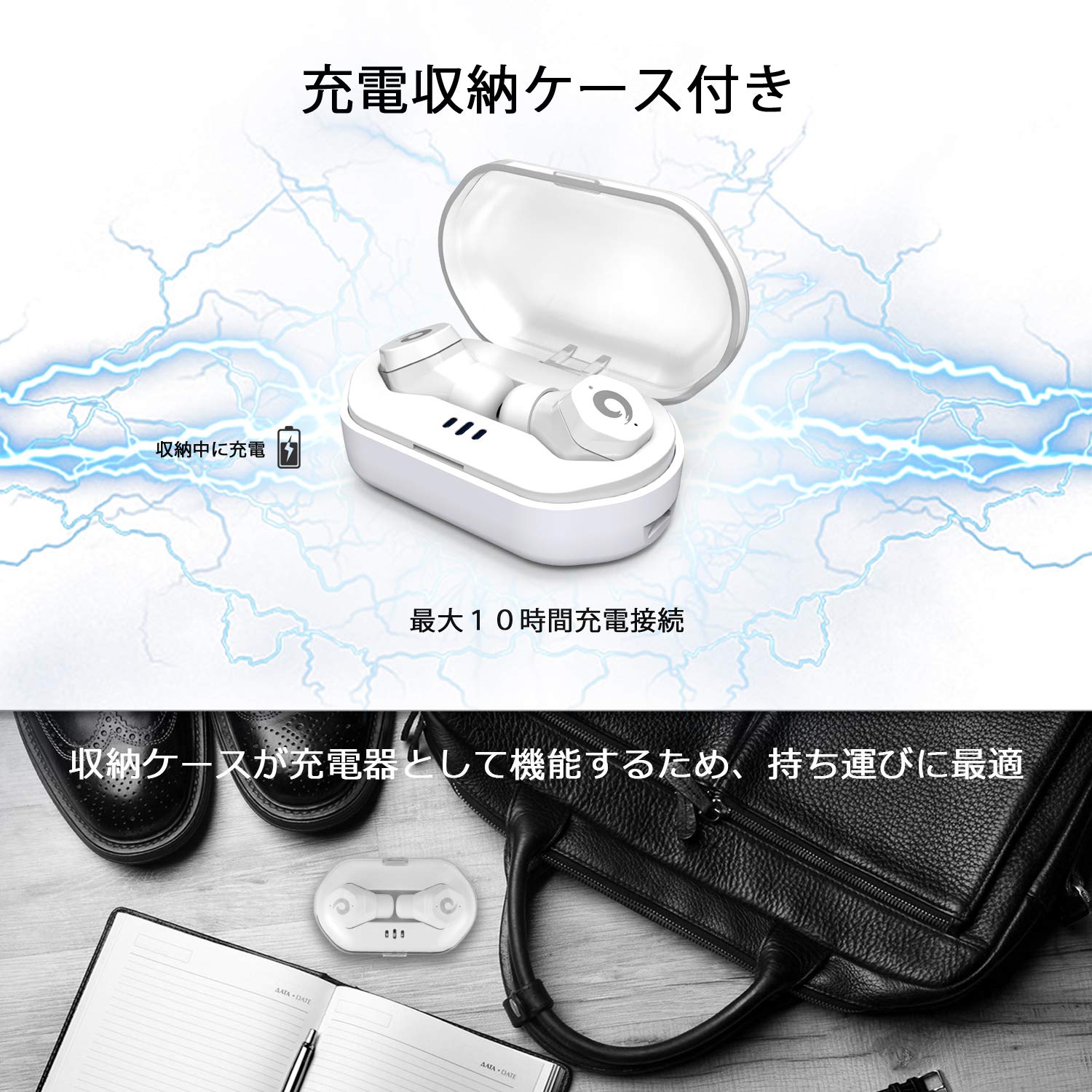 【収納ケース一体型】充電機能付きの収納ケースを付属し、イヤホンを紛失防止だけではなく、同時に繰り返し充電も出来ます。安全性が高いマグネット吸着の充電方式でワンタッチで充電で楽々ですよ。尚且つ、充電ケースはストラップホールがあり、持ち運べで出張、旅行、出かけに最適します。