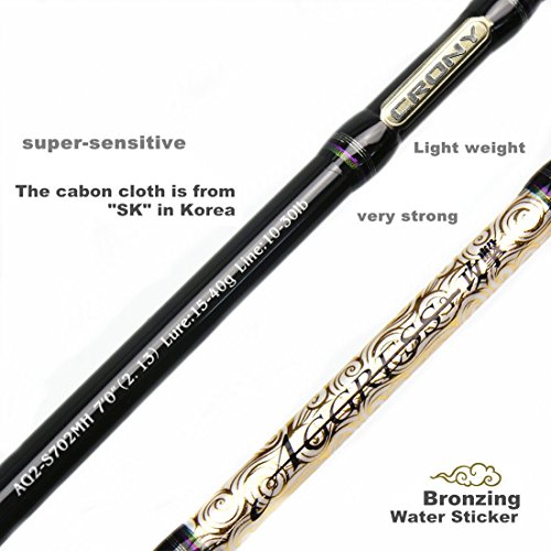 Lightweight and super-sensitive, very strong based on "SK" carbon fiber made in Korea. The guides come from American tackle company inc., new style hurricane shape fishing guides, super quality. The high quality reel seat with glossy black finish, the golden color trim ring is on the front hood, when you twist the front hood, the reel seat will make a nice noise.