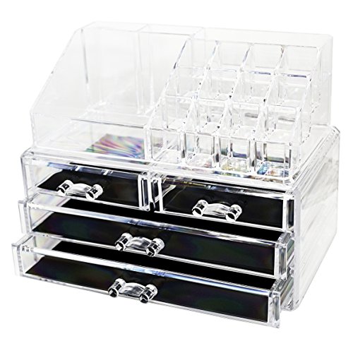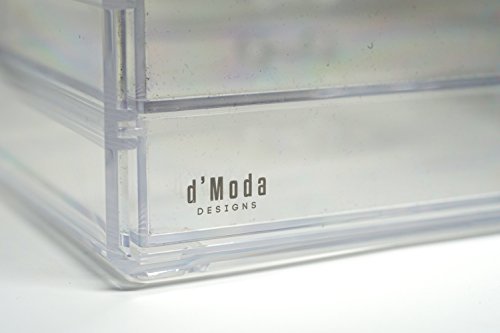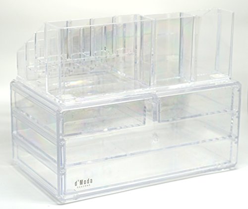 d'Moda Designs Crystal Clear Acrylic Two-Piece Makeup and Jewelry Organizer Set with 4 Storage Drawers and Tray for Lipstick, Brushes, Compacts, Nail Polish and Cosmetics