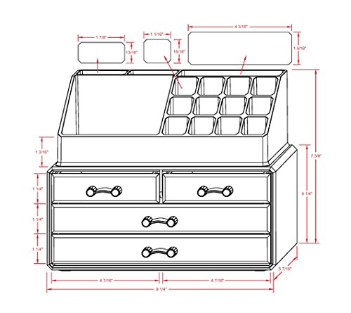 Keep everything in one place! Organizer tray and storage drawers hold moisturizers, mascara, eyelash curlers and more. Overall size: 9.3 x 6.0 x 7.4 inch. See photos for tray and drawer dimensions.