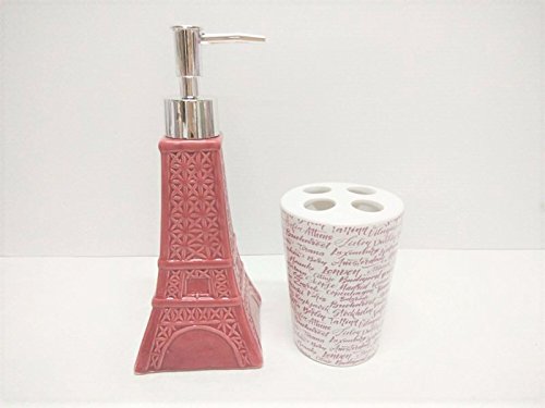Royal Bath Novelty Paris Glamour Eiffel Tower 2 Piece Ceramic Bath Set: 1 Lotion Pump and 1 Toothbrush Holder - Pink