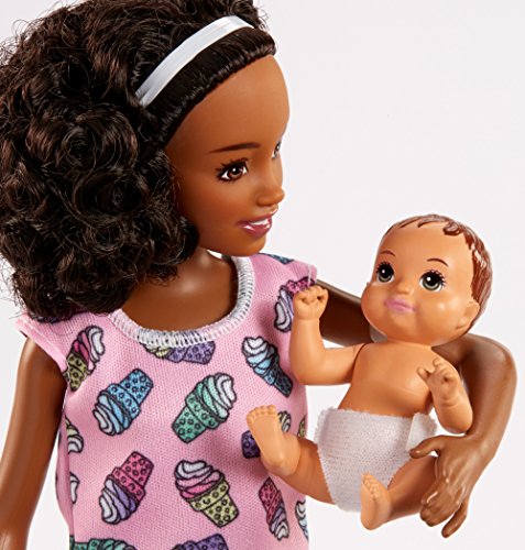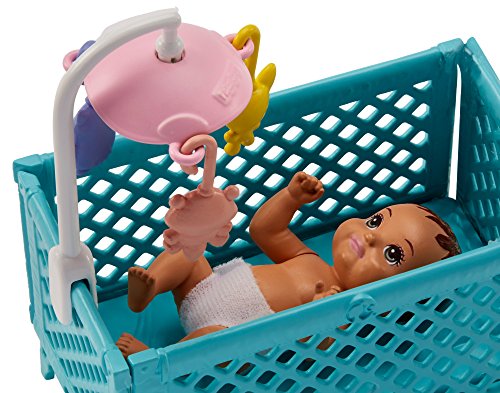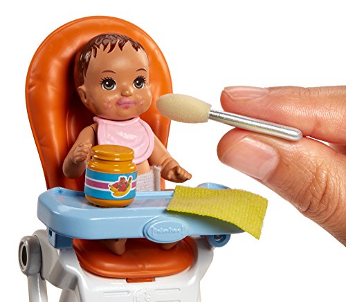 -. Feature : Play out classic babysitting moments with a Barbie Skipper Babysitters Inc. playset with a babysitter doll, a baby doll and accessories themed to feeding and naptime, including a high chair and a crib / Working features and transformation serve up fun: the baby doll's face has a color-change feature that goes from clean to food-spattered, and the crib has a spinning mobile / Dip the spoon-like sponge into cold water and apply to baby's face to see food appear around her mouth; then clean her up using the wipe cloth and warm water / Ingredients for feeding fun include a jar of baby food, a box of cereal, a bowl, a baby toy and two bottles / The high chair, the crib and its spinning mobile are designed in bright colors with iconic baby touches