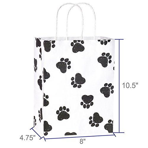 Kraft Paper Bags Specifications: ?Shopping bags Size: 8"W x 4.75"D x 10.5"H ?Package of Dog's Paw Prints bags: 25pcs/pack ?Bags Material: 100g basis weight. Made of 40% PCW Recycle Paper with a serrated top edge. 0
