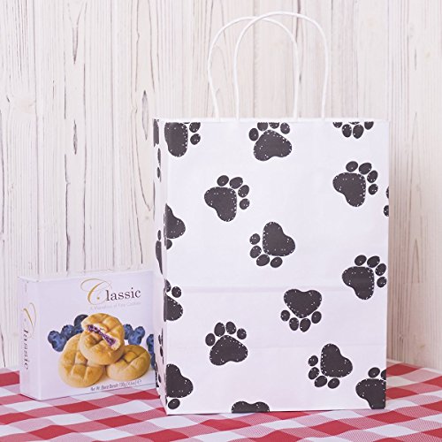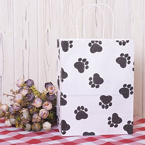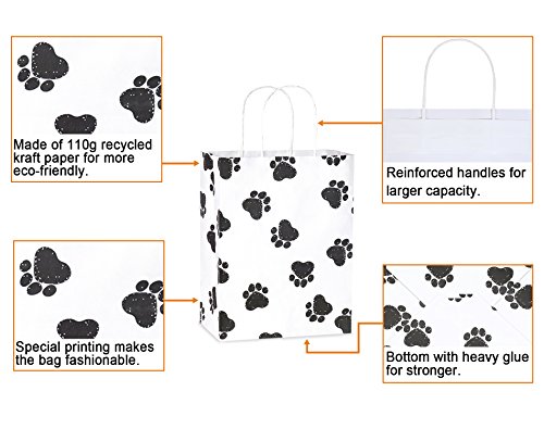 ?Our kraft shopping bags are glossy paper which make them a little more elegant looking than the plastic which tend to tear easily. ?The retail paper bags are perfect size and work beautifully for your business. At this price, they are nice to be able to place product in such an elegant handy bag for your customers. On the other hand, you could print your own labels/logo stamp and put them on each bag, made the shopping bags on behalf of your store. ?Different from the blank kraft bags, customers would be impressed by these fashion Dog's Paw Prints paper bags. The unique design make them suprise. They are perfect as shopping bags, gift bags and also good for wedding.