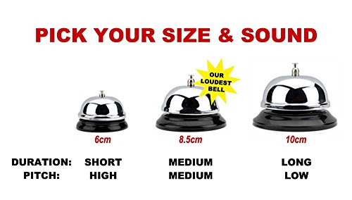 - Feature : Choose your own pitch: 6cm, 8.5cm, and 10cm bells available, each with a different tone / Rings loud and clear, with none of the muffling caused by cheap plastic components / Durable carbon steel bell and ringer with a showy chrome finish / Classic, timeless design with black plastic base / Stands up to tough restaurant use, also great for hotel and office receptionists, even games of Bunco