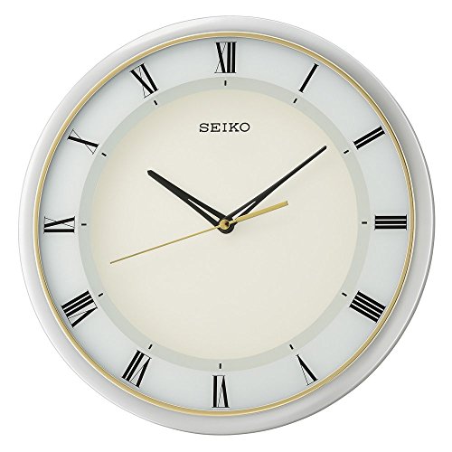 Embrace the simplicity of the Seiko Silver Metallic 12 in. Wall Clock for your kitchen, living room, or office space. Luminous hands and numerals will come in useful during those midnight fridge raids or trips to the bathroom. The quiet sweep of the second hand won't get under your skin the way the constant ticking of a regular clock will. And because it's from Seiko, you know you can trust this quality clock to last you for years to come. Dimensions: 12.25 diam. x 1.5D in.. Clock is made of silver plastic with gold accents. Second hand moves quietly. Hands and numbers glow in the dark. Round-shaped wall clock. Requires 1 AA battery.Feature