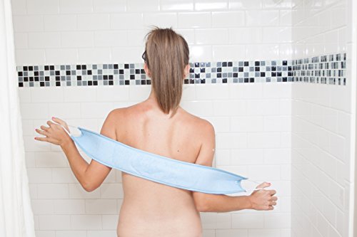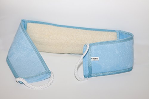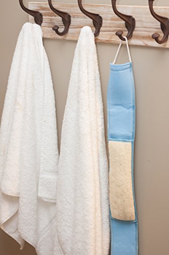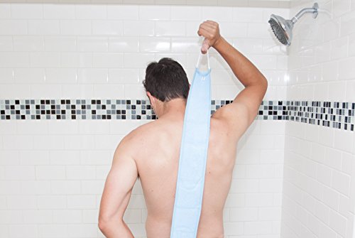 Natural, high-end, 4x32 in. exfoliating back scrubber. This is the perfect exfoliating shower scrubber for cleaning the back, neck, shoulders, feet and hard to reach places. Our fun, blue loofah will mesh perfectly with your bathroom decor. The all-natural Loofah scrubber soothes and exfoliates dry or rough skin, eczema, back acne, and more. Ergonomic, easy-grip handles make cleaning your entire body quick and easy. The blue, ultra-soft cotton outer layer gently polishes and soothes the skin while it cleans. Apply creams or self-tanners effortlessly. No more splotchy self-tanner streaks! This extra-long loofah sponge can easily be cleaned. Add a little color to your shower with the amazing, exfoliating BLOOFAH. Clean, Exfoliate, Dominate your shower game!Feature