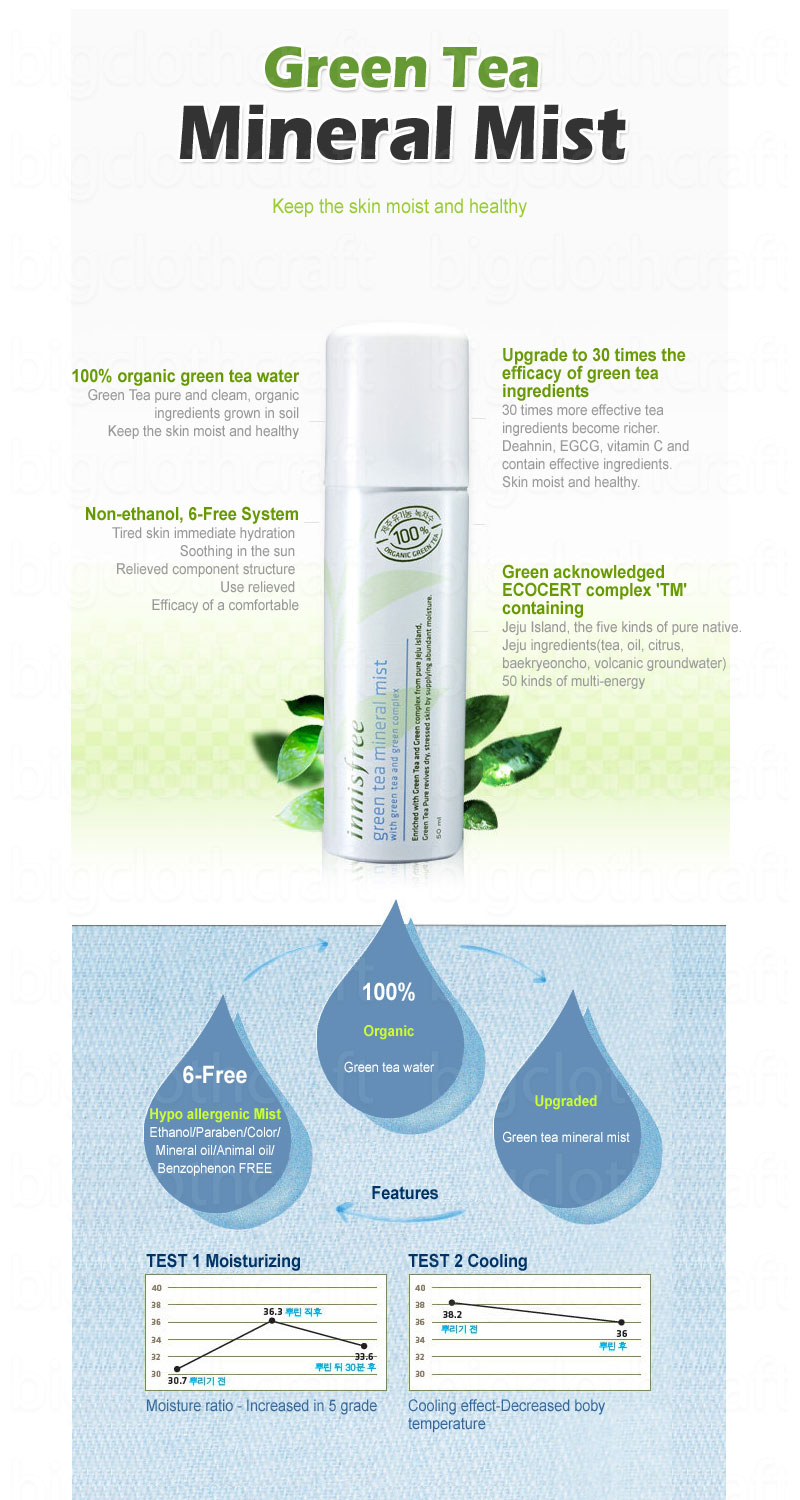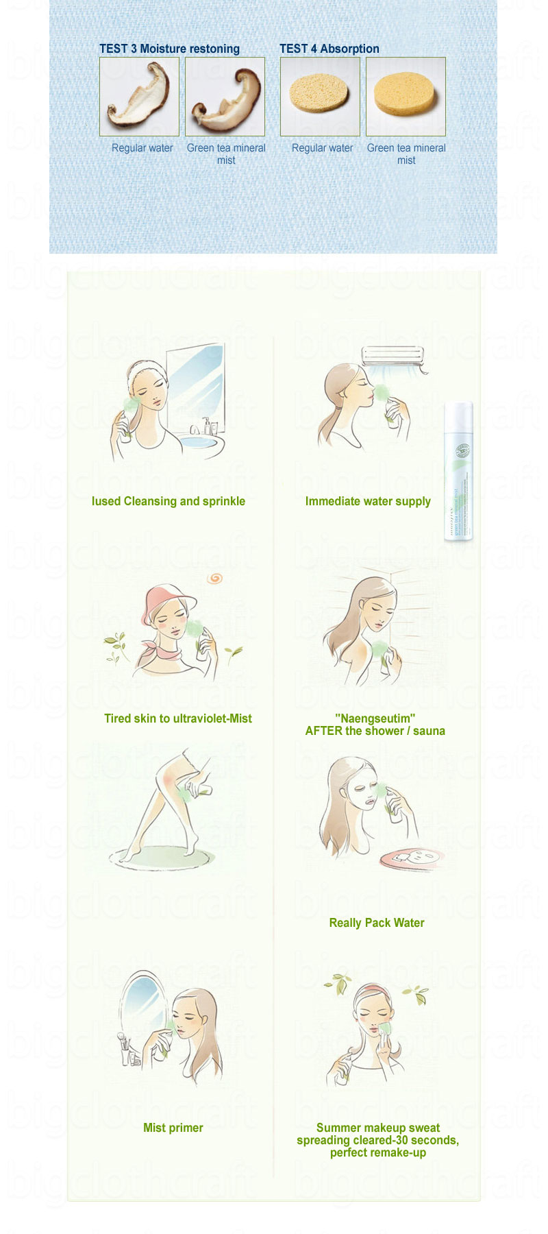 | This is Brand New Original Innisfree Cosmetics Free gift is sample pouch.(Brand of pouch may be replaced by other Famous Brand) ========================================================= Innisfree Green Tea Mineral Mist 150ml Green Tea Mineral Mist with green tea and green complex Enriched with Green Tea and Green complex from pure Jeju island. Green Tea Pure revives dry, stressed skin by supplying abundant moisture. With its eco-friendly Jeju green tea moisture, this hypoallergenic ethanol-free facial mist instantly replenishes moisture to your thirsty skin. Directions Whenever your skin feels dry, spray onto facewith your eyes closed. It can be applied before and after makeup. (*Do not shake before use.) |