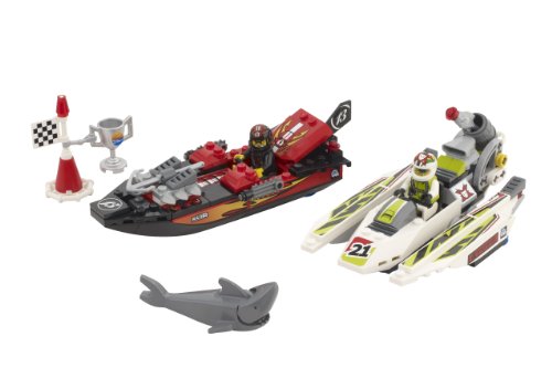 - Feature : Includes 2 minifigures: 1 green team driver and 1 red team driver / Build 2 race boats: Green team boat with fish missile launcher and red team boat with harpoon / Buoy and trophy included / Look out for the shark / 191 LEGO pieces