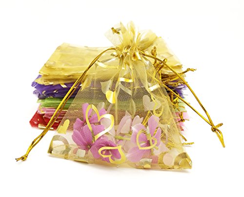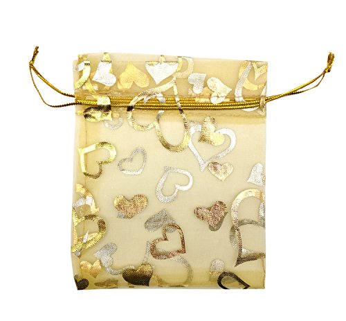 SUNGULF 100pcs Organza Pouch Bag Drawstring 4"x5" Strong Gift Candy Bag Jewelry Party Wedding Favor (Gold Heart)
