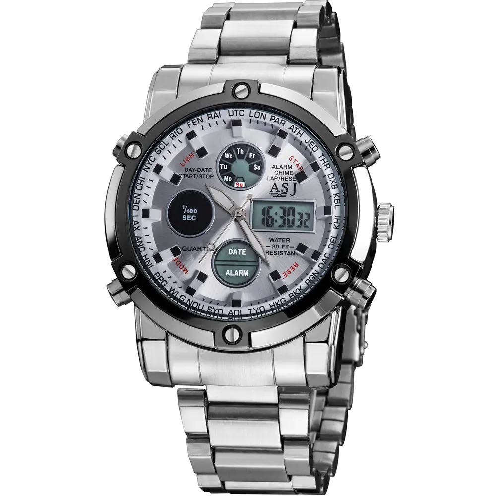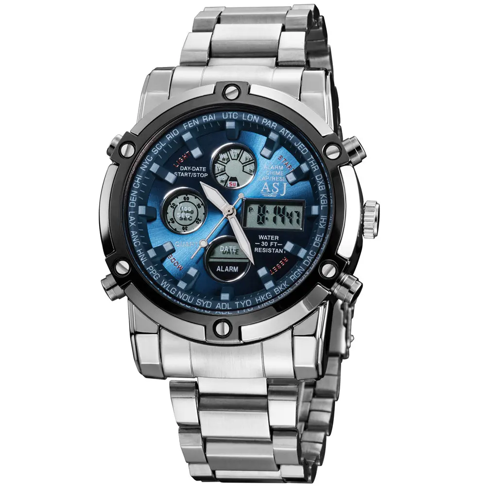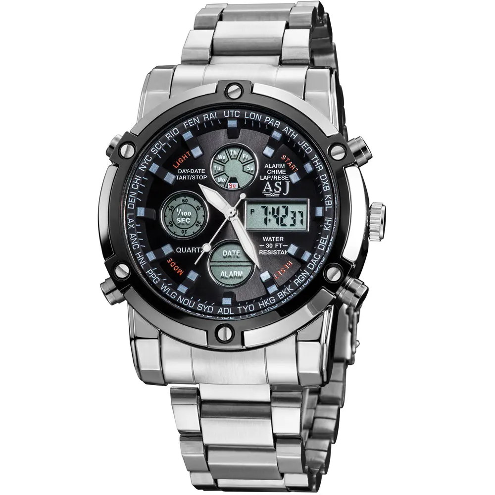 Feature:Alarm,Back Light,Water Resistant,Shock Resistant,Stop Watch,Complete Calendar,Multiple Time Zone,Chronograph,Auto Date,LED display
