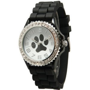 -. Title : Black Paw Face Silicone Watch w/ CZ Crystal Rhinestones Face Bling