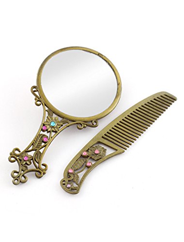 uxcell Lady Retro Style Rhinestone Inlaid Makeup Mirror Comb Bronze Tone