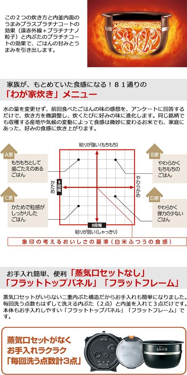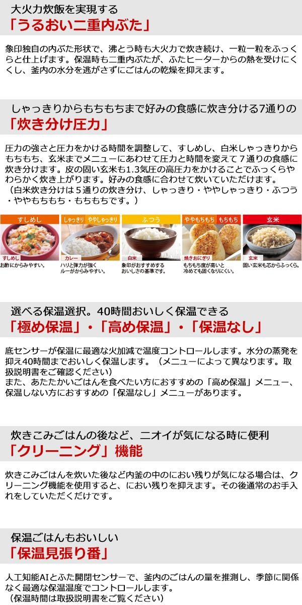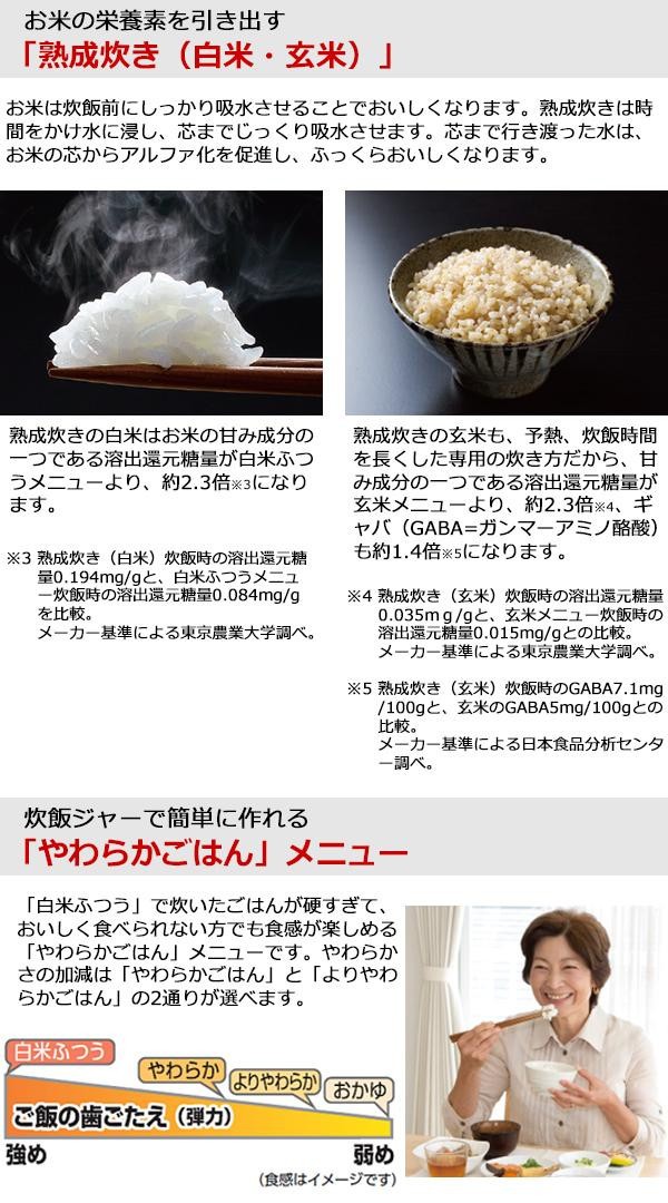 | 付属品 | しゃもじ、しゃもじ受け、計量カップ(白米用・無洗米専用)、取扱説明書兼保証書(保証期間:1年間※内釜フッ素加工:3年間) ※取扱説明書に「お料理ノート」ページあり |