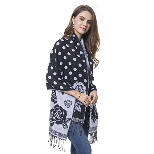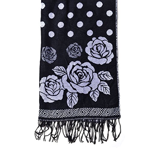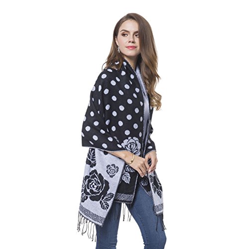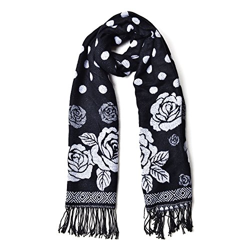 Product Description This black and white rose, and polka dot pattern 60% acrylic and 40% polyester reversible shawl will give you a smart and trendy look. Wear it on any occasion. You are assured of a look that will never go unappreciated. 0