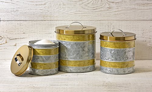 [Product Information]- The Amelia collection is metal storage canisters with a galvanized metal finish and gold accent bands and a gold colored push top lid