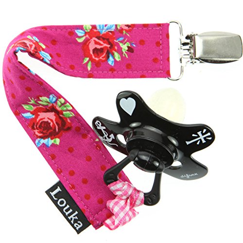-. Title : Louka Schnullerband mit Namen fuchsia Rosen Schnullerkette Stoff, bestickte Baby Namen, Schnullerband ist handgefertig