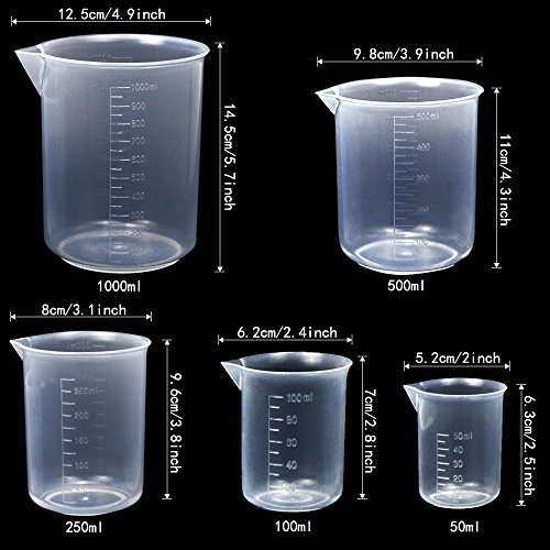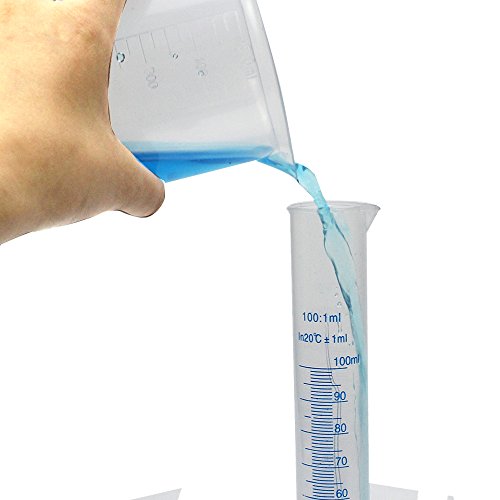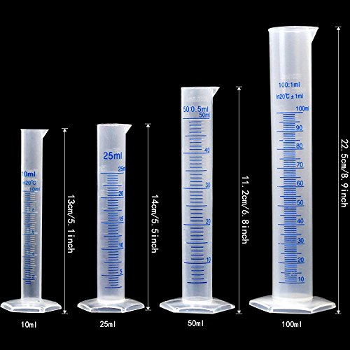 APLANET 4 Transparent Plastic Graduated Cylinders, 10ml, 25ml, 50ml, 100ml, with 5 Plastic Beakers and 1 Brush