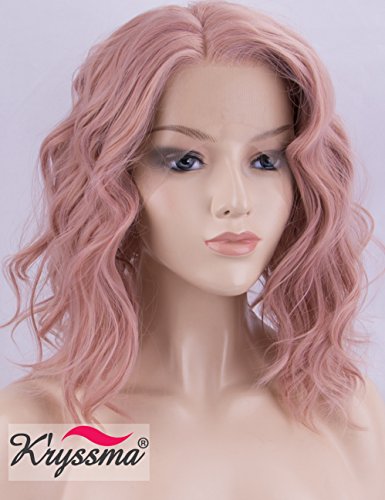 K’ryssma Short Bob Lace Front Wigs Wavy, Rose Gold Synthetic Wigs for Women Half Hand Tied Peach Pink Lace Wig with Side Parting Heat Resistant Christmas Wig