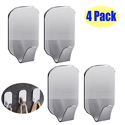 GreatforU Towel Hooks Wall Hanging Hook Heavy Duty Stainless Steel 3M Self Adhesive Stick On Hooks Waterproof for Home Bathroom Kitchen Refrigerator Door Keys Bags Robe Coat (4 Pack)