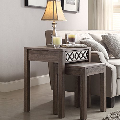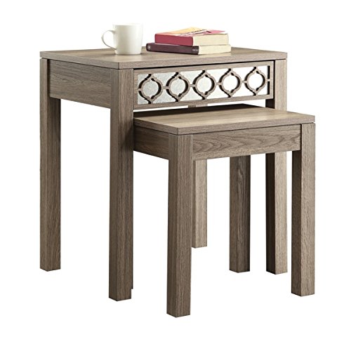 -. Brand : Office Star -. Color : Brown -. EAN : 0674894230319 -. Feature : The hourglass curves of the ogee inlay motif across mirrored glass create a stunning display reminiscent of Morocco or Arabia. Eco-friendly engineered wood and the sun-bleached driftwood style finish creates a beautifully practical look. -. MPN : HLN19-GK -. PartNumber : HLN19-GK -. ProductGroup : Furniture -. ProductTypeName : HOME_FURNITURE_AND_DECOR -. Title : Ave Six Sun Bleached Oak Nesting Tables -. UPC : 674894230319