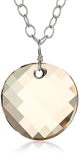 The Swarovski Elements Golden Shadow Twist Pendant Necklace has a design that is both luxuriantly elegant and sweetly simple. A 1-inch-wide disk is cut from Swarovski crystal with tiny facets and beveled edges for lots of glittery shine. The golden yellow crystal disk hangs from a wire-wrapped loop that provides a delicate look to the necklace. Suspended from a 24-inch 925 sterling silver Figaro chain, the necklace closes with a lobster-claw clasp. With its medium-long drop, this necklace is up-to-date and trendy yet classy and graceful. Wear it with a deep V-neck top or dress and dangly silver earrings for a stunning evening look.