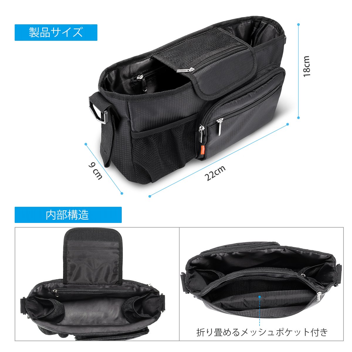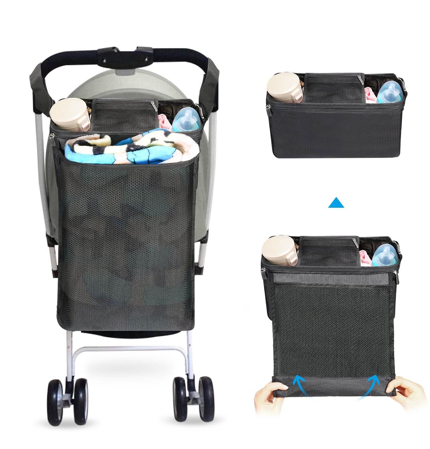 With mesh pocket of 27.5 cm x 39.5 cm, you can store baby diapers, toys, wet tissues well enough.