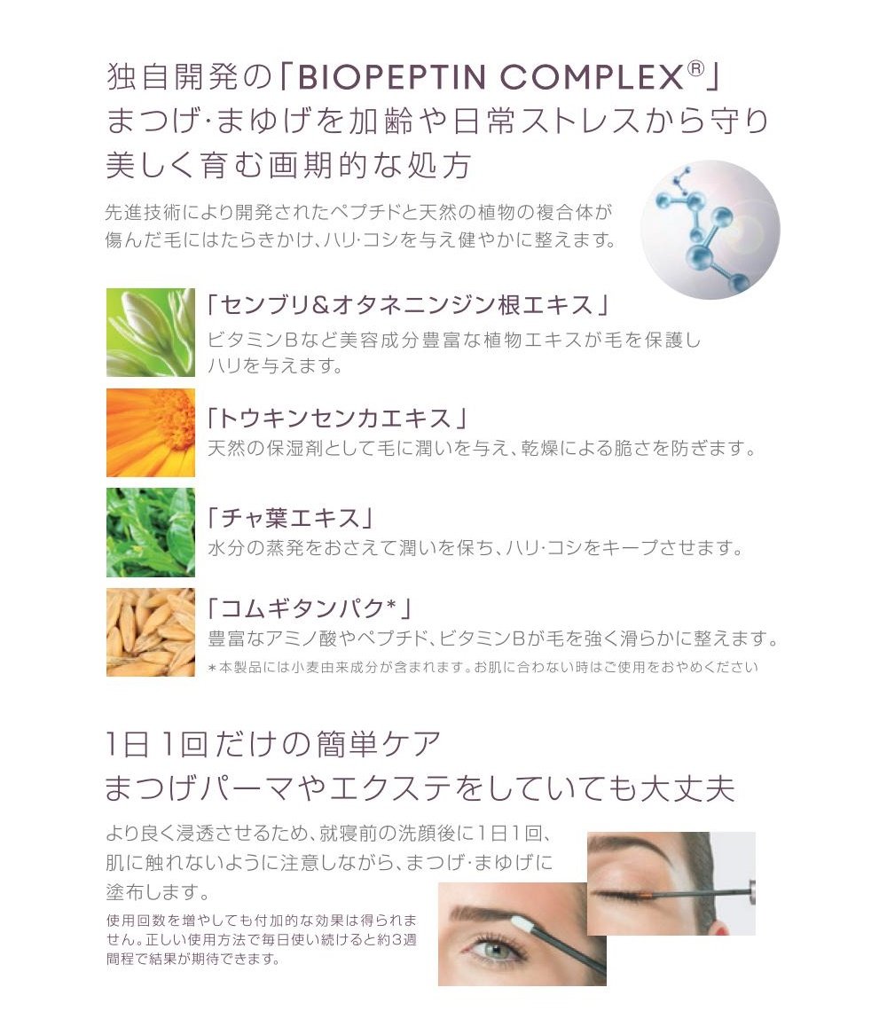 · Highly effective proprietary ingredient Biopeptin Complex (complex of peptide and vegetable ingredients) fills eyelash with moisture and leads to soft, healthy and luxurious condition.